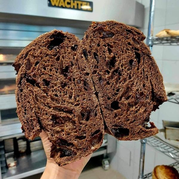Skład: mąka pszenna 750, mąka pszenna 1850, mąka żytnia 2000, kakao, espresso, czekolada deserowa, suszona śliwka, szczypta cukru trzcinowego i cynamonu, zakwas żytni, woda, sól