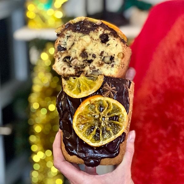 Mąka pszenna typ 500, masło, jajka z wolnego wybiegu, cukier, płatki migdałowe, rodzynki, żurawina suszona, orzechy laskowe, figa hiszpańska, orzechy włoskie, śmietana 30%, czekolada deserowa. Waga około: 800g.