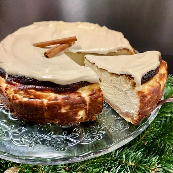 Sernik baskijski na korzennym spodzie. Wykończony kremem ganasz z dodatkiem przypraw chai masala