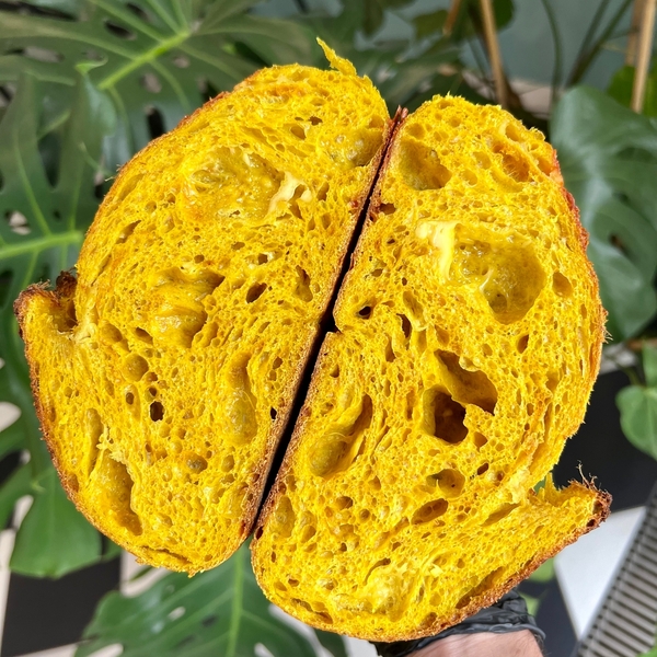 Skład: mąka pszenna 750, mąka pszenna 1850, mąka żytnia 2000, cheddar, kurkuma, zakwas żytni, woda, sól